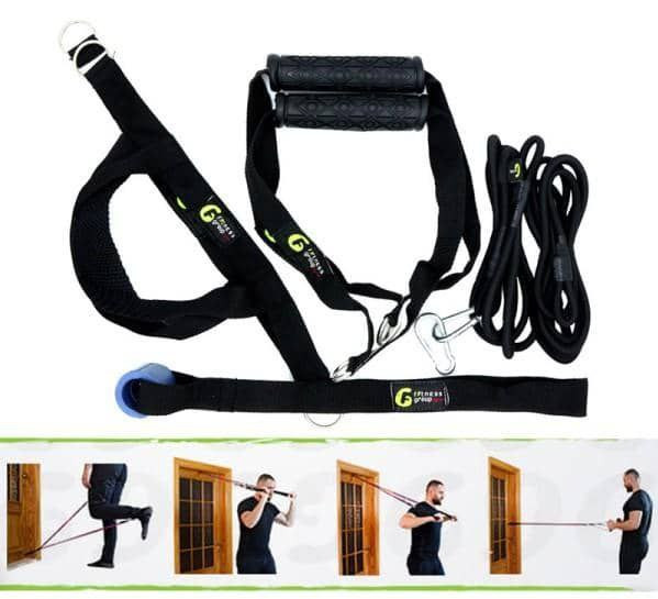 instructions : connect the hand grips and the leg belts with the fastening belt using the metal loops and the elastic ropes , hang the fastening belt on the door