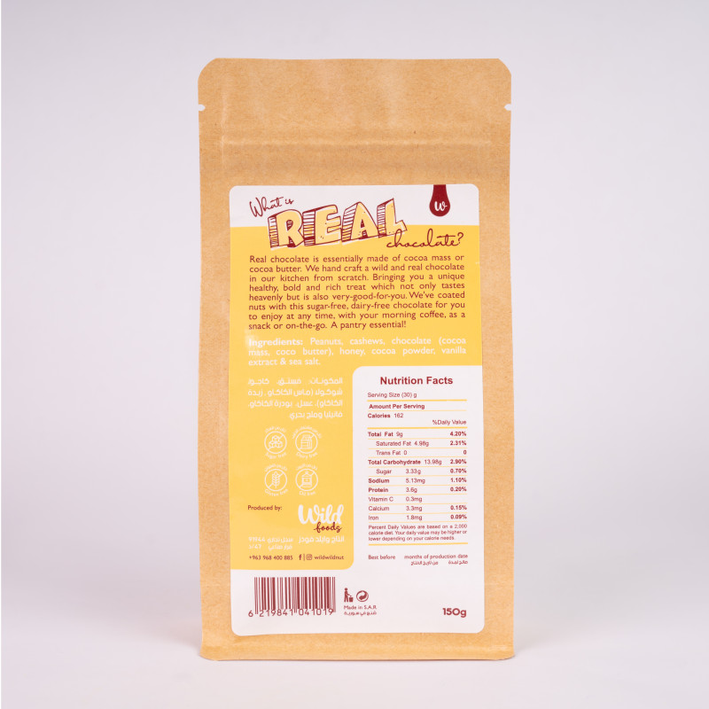 Ingredients: Peanuts, cashew, chocolate (cocoa mass, cocoa butter) , honey, cocoa powder, vanilla extract & sea salt.