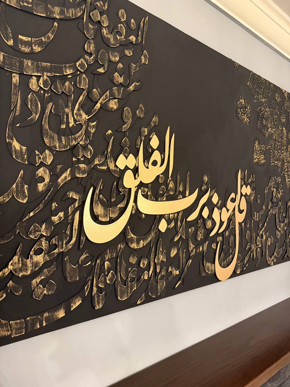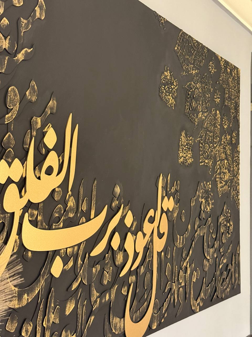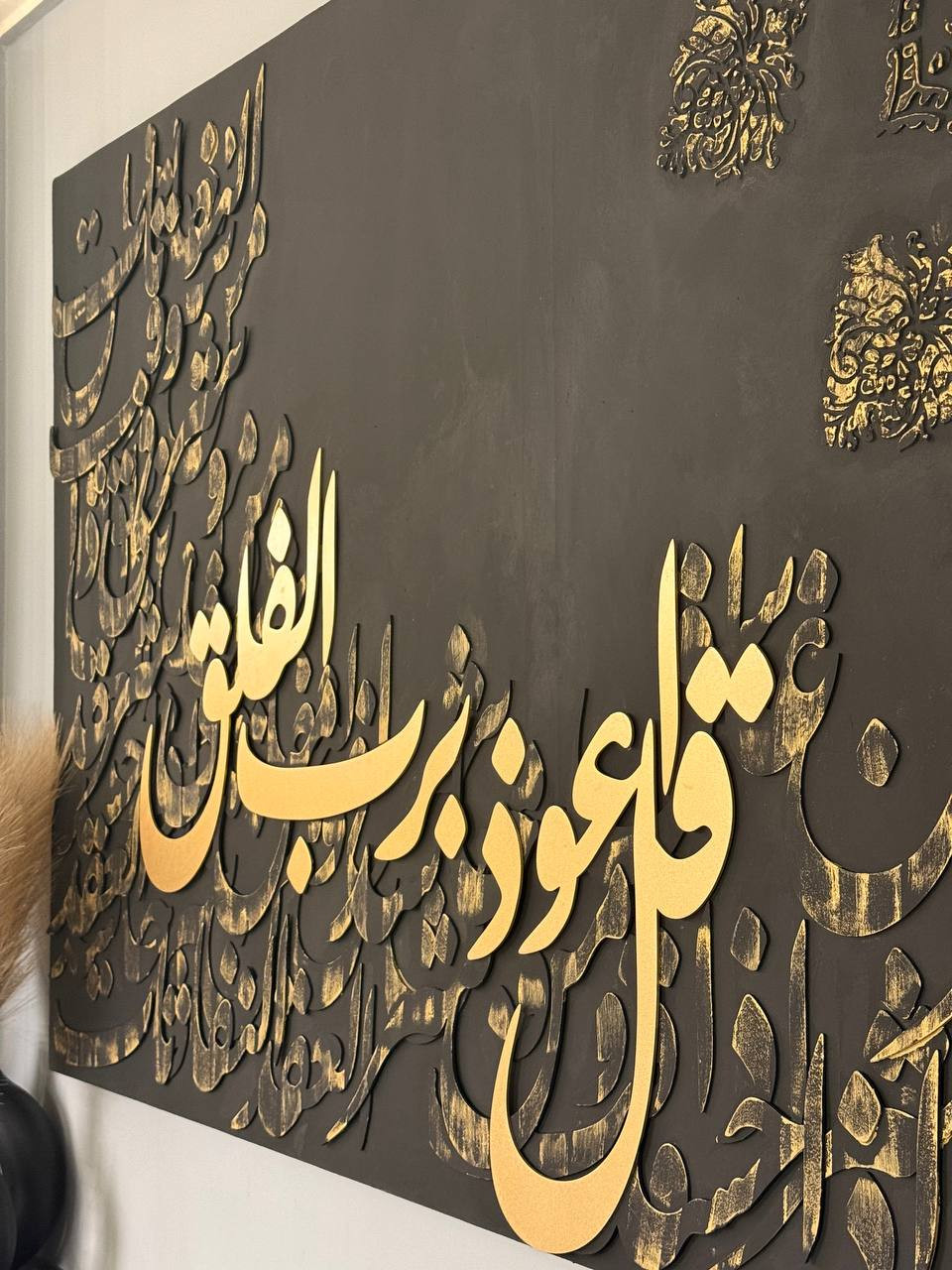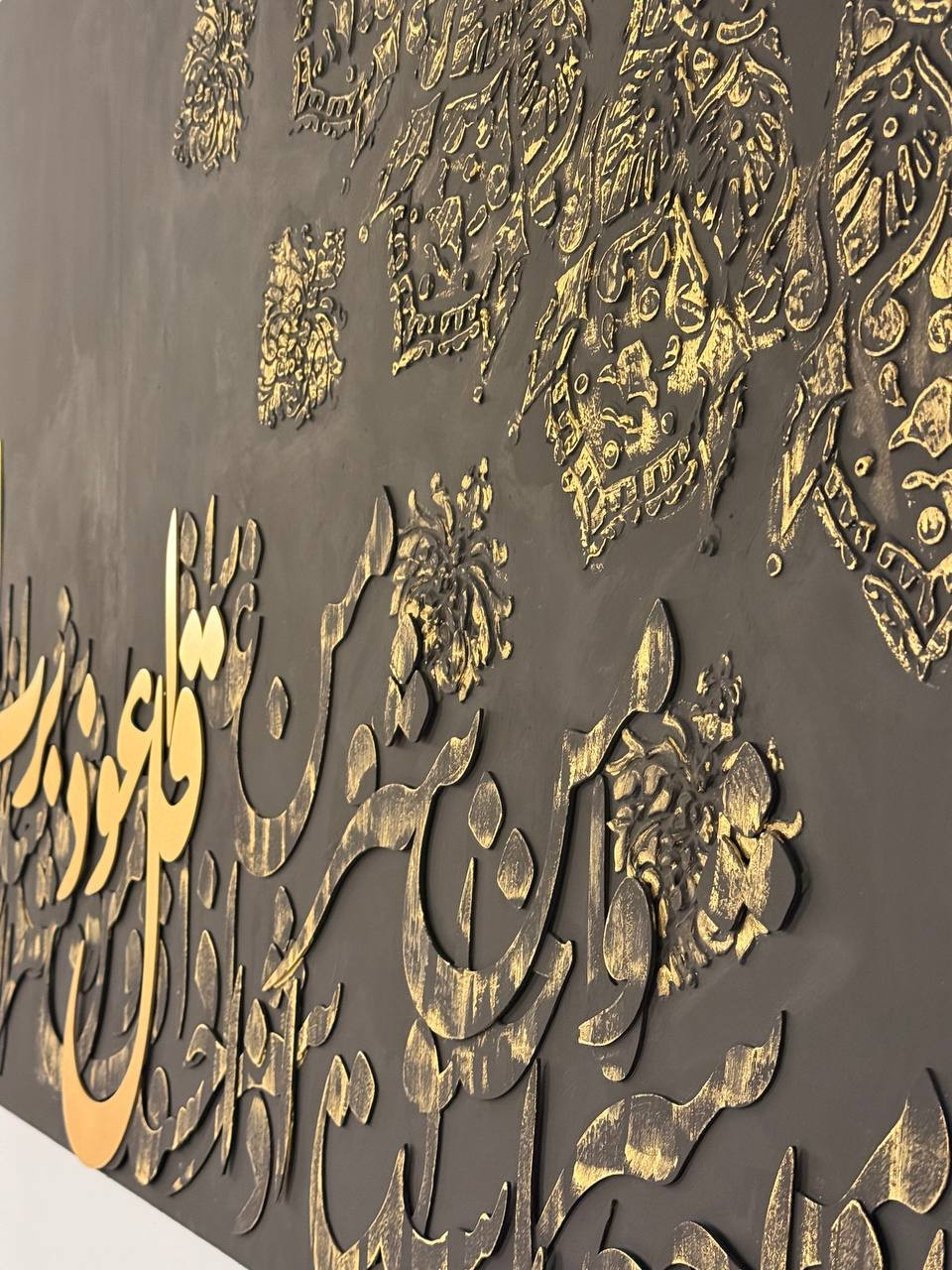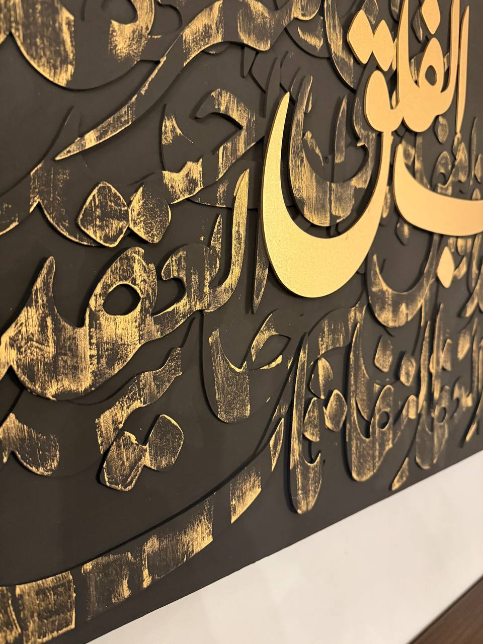 Al falaq surah .....Acrylic colors stencil art and multi-layered vintage MDF wood calligraphy on canvas